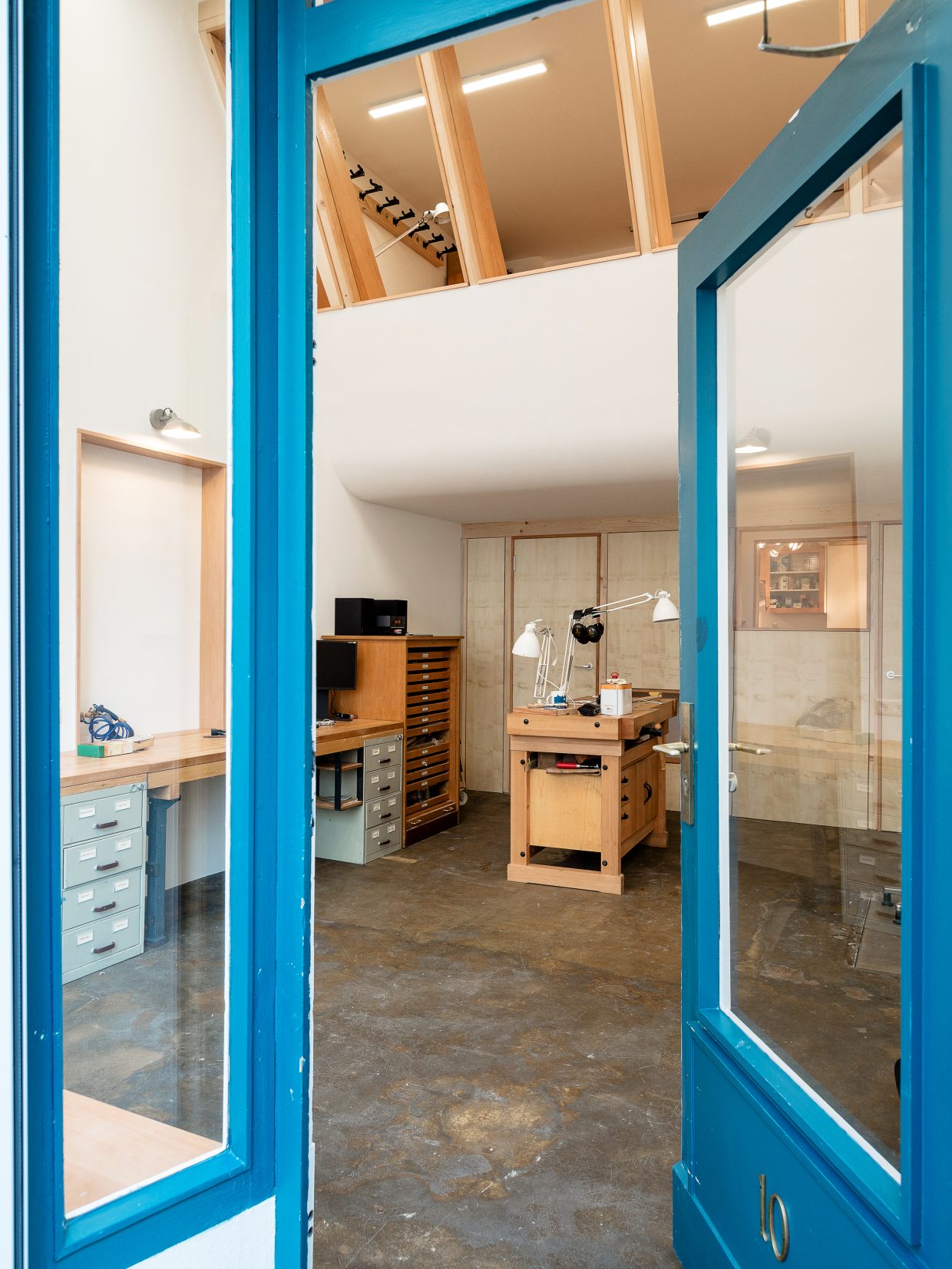 Eine schmale Ladenwerkstatt in Schöneberg wurde zur Gitarrenwerkstatt ausgebaut. Das junge Gitarrenbauer-Paar hat die Details des Innenausbaus größtenteils selbst gefertigt. Es war spannend und nicht ganz einfach, die verschiedenen von einander getrennten Bereiche mit unterschiedlicher Luftfeuchtigkeit und Temperatur, die für die verschiedenen Arbeitsprozesse beim Gitarrenbau erforderlich sind, umzusetzen. Direkt hinter dem Schaufenster stehen die Werkbänke, wo auch der Kundenkontakt stattfindet. Auf einer Hochebene finden die Reparaturen statt. Im Keller befindet sich die Werkstatt mit den schweren Maschinen. Im hinteren Teil befindet sich die Küche. Alle Bereiche haben interessante Blickbeziehungen durch die großzügigen Verglasungen. Eine Wand wurde aufgedoppelt um die Klimatechnik-, die Druckluft- und die Staubsaugeranlage aufzunehmen. Dieses Projekt entstand in Zusammenarbeit mit bauste berlin.