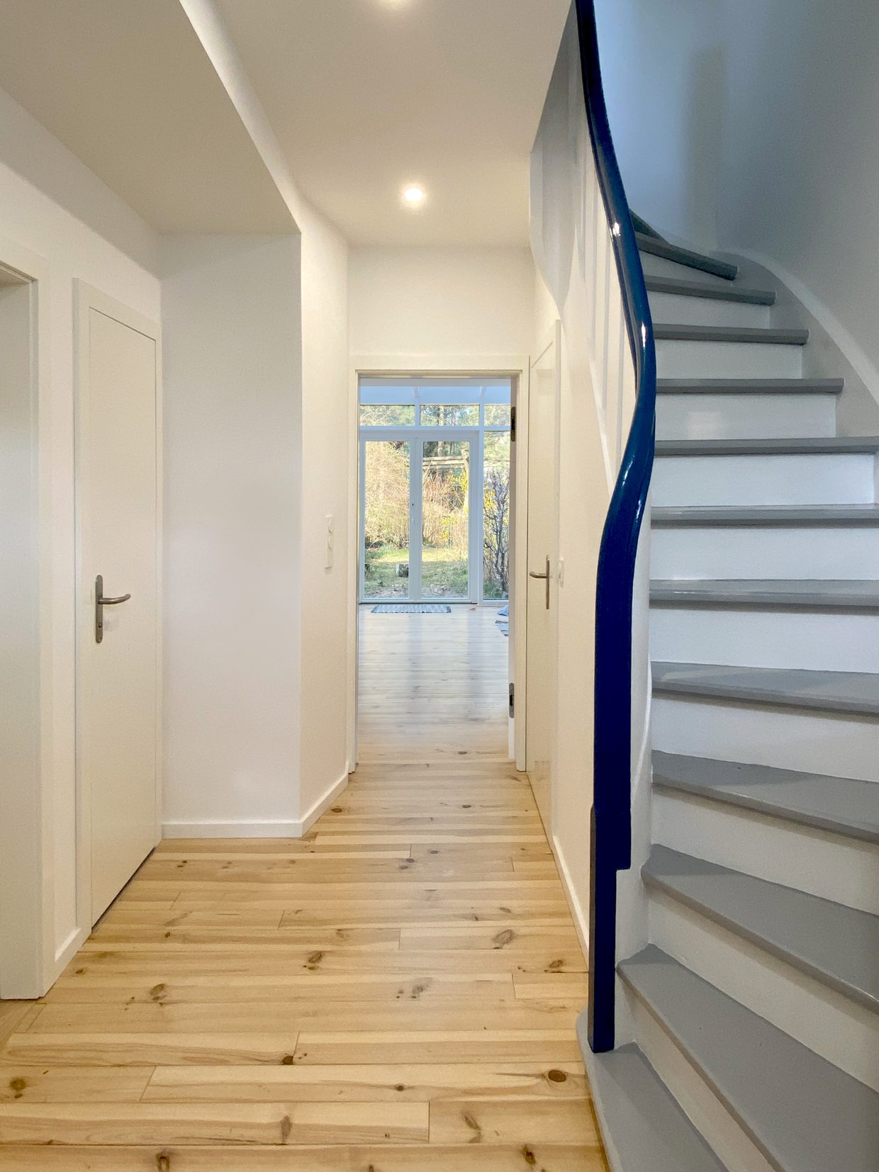 Das erste Obergeschoss blieb weitgehend unverändert aber das Dachgeschoss wurde vollständig ausgebaut und trotz niedriger Deckenhöhe wurde ein großes Badezimmer, das Elternschlafzimmer und ein Gästezimmer realisiert.