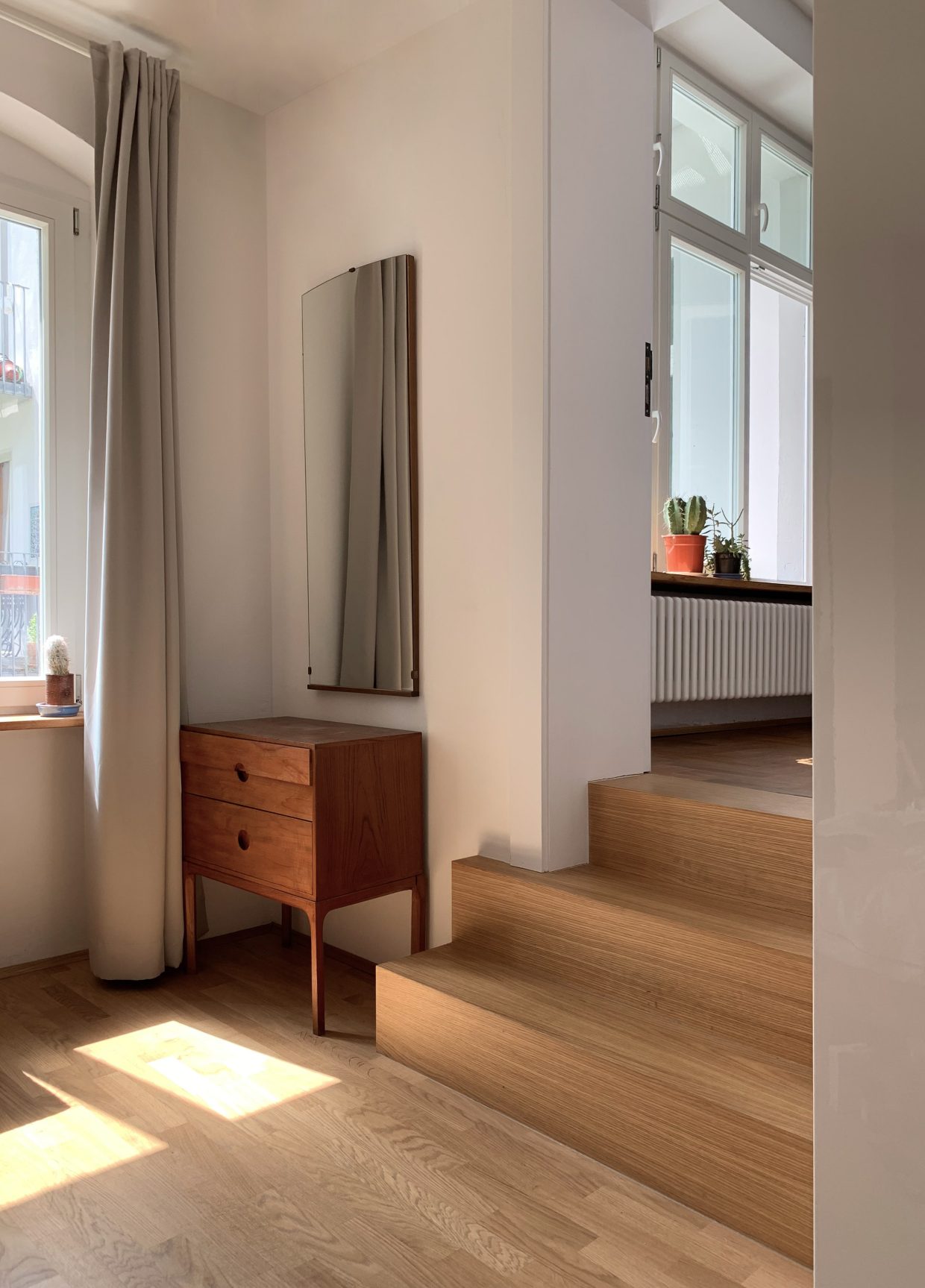 Zwei Wohnungen wurden zusammengelegt. Die kleinere Wohnung, die dann zum Elternschlafbereich umfunktioniert wurde, liegt im Seitenflügel. Dieser hat eine etwas geringere Geschosshöhe, dadurch wurde eine Treppe zwischen den Bereichen notwendig. Die Küche wurde in das Berliner Zimmer verlegt. Das Gästebad wurde etwas in der Tiefe reduziert, um Platz für eine kleine Garderobe zu schaffen. Im Flur wurde ein Abstellbereich geschaffen, der möglichst unsichtbar eingefügt ist. Im Elternbad kam ein monolithischer Oberflächen-Spachtel zum Einsatz.