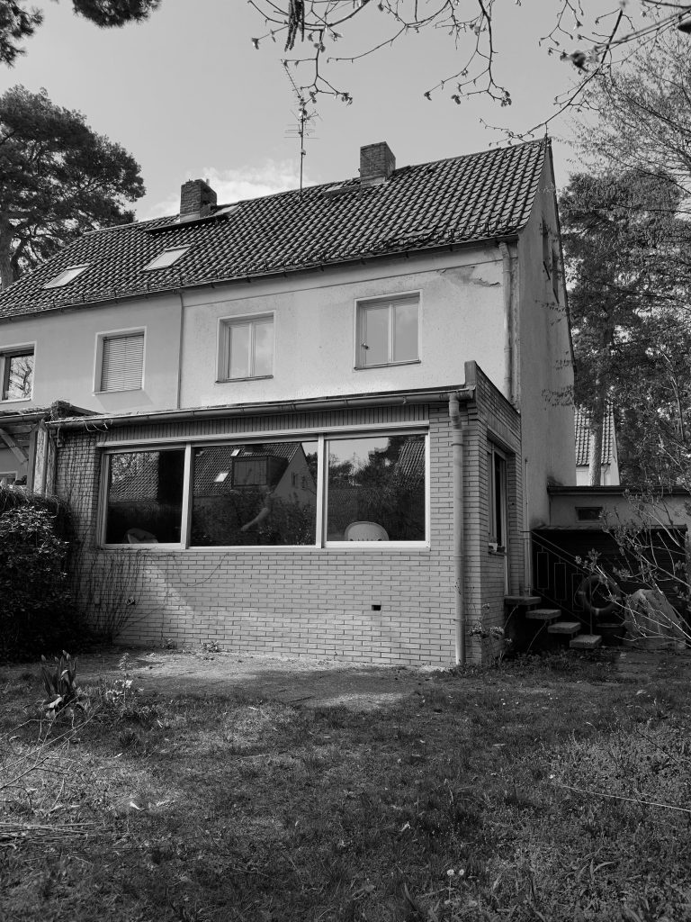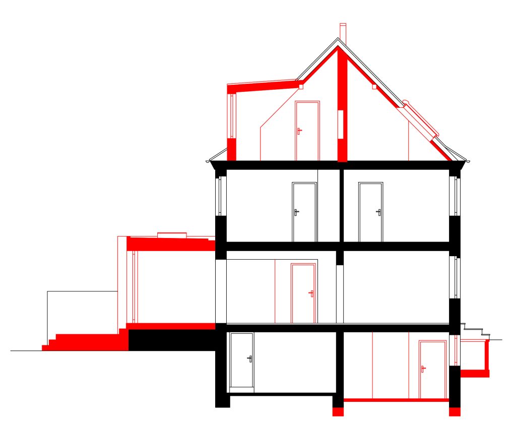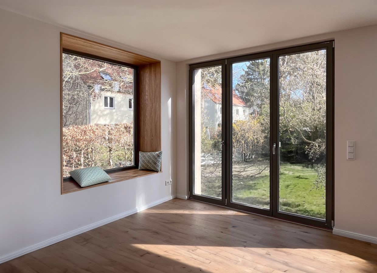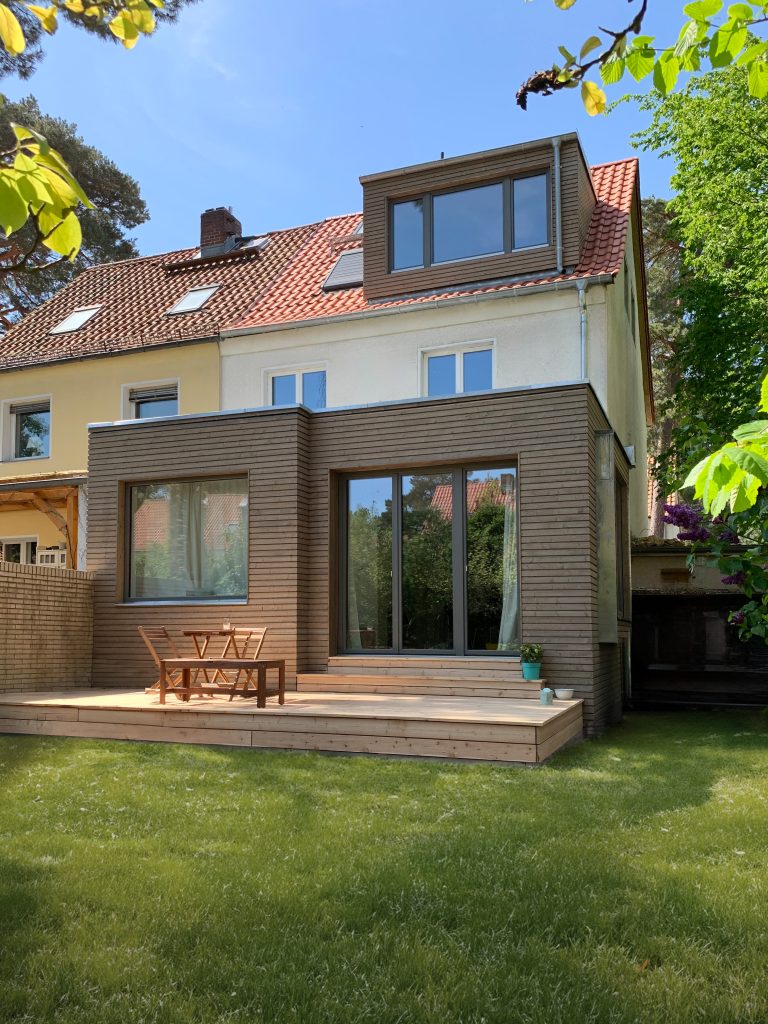 Die Doppelhaushälfte sollte für eine bald vierköpfige Familie umgebaut werden. Im Erdgeschoss wurde der alte, tiefer liegende, Anbau durch einen modernen Anbau ersetzt und auf voller Breite mit dem Wohn- und Esszimmer verbunden. Ein Seitenfenster des Anbaus schiebt sich etwas aus der Fassade, um eine breite Fensterleibung als Sitzfläche zu bieten. An den Anbau schließt die Terrasse an. Die Küche wurde an die Straßenseite verlegt, wobei der Flur noch erweitert wurde, um eine großzügigere Eingangssituation zu schaffen. In den Keller gelangt man über eine fast unsichtbare Tür in der modernen Treppenverkleidung. Hier wurde der Boden eines Raumes tiefer gelegt, um ein Gästezimmer zu ermöglichen. Im Dachgeschoss entstand gartenseitig eine Gaube, die nun das neue Elternschlafzimmer erweitert.