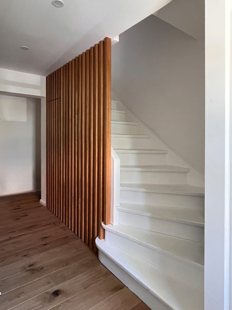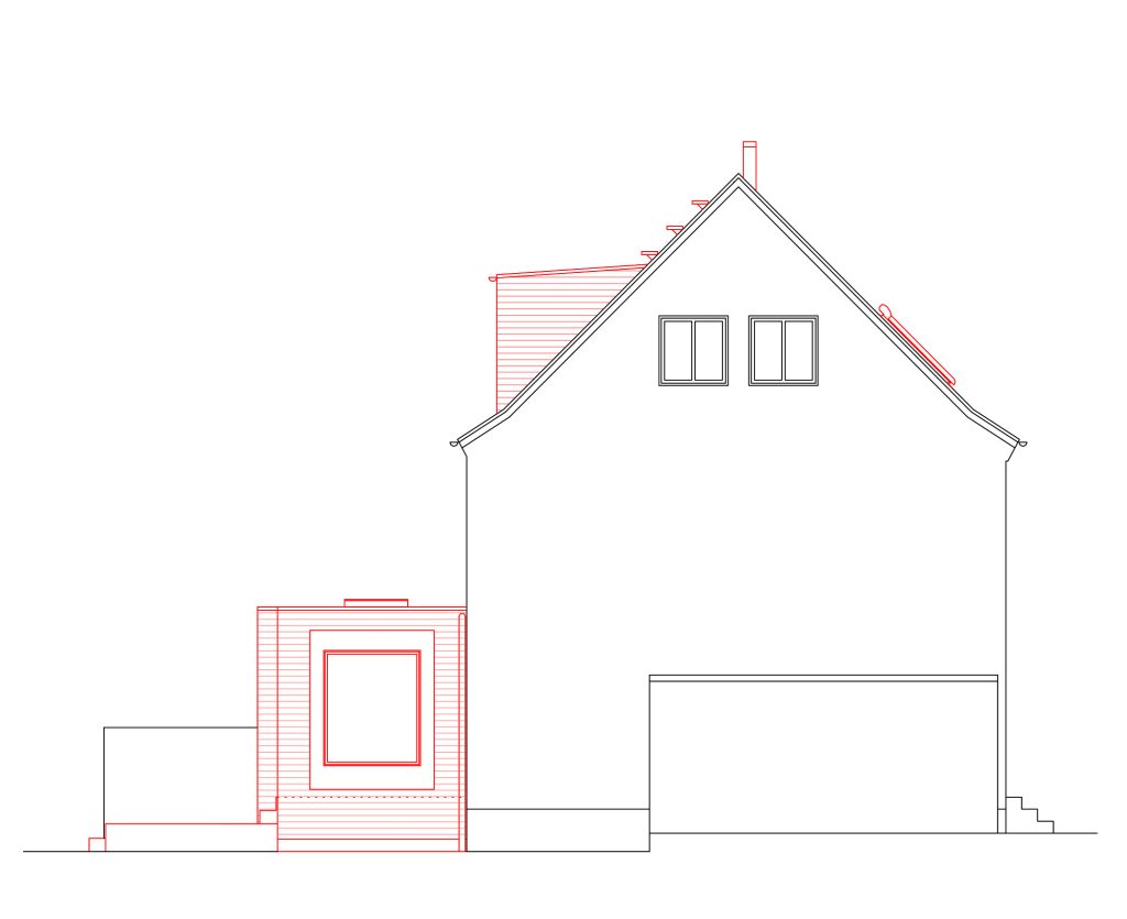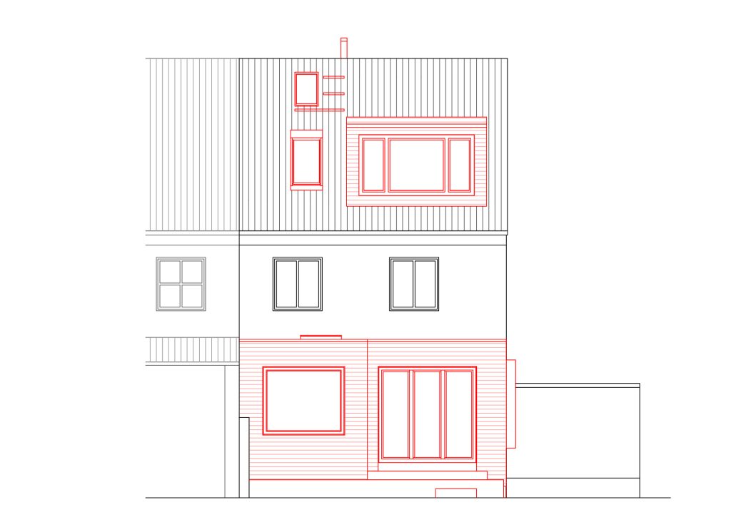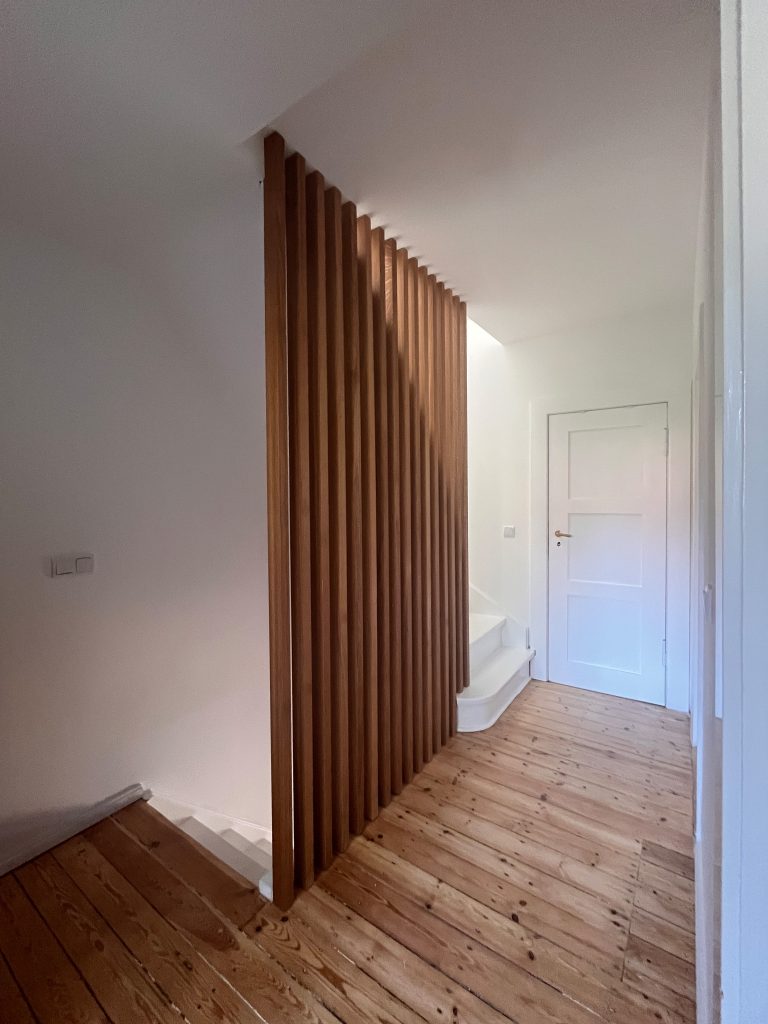 Die Doppelhaushälfte sollte für eine bald vierköpfige Familie umgebaut werden. Im Erdgeschoss wurde der alte, tiefer liegende, Anbau durch einen modernen Anbau ersetzt und auf voller Breite mit dem Wohn- und Esszimmer verbunden. Ein Seitenfenster des Anbaus schiebt sich etwas aus der Fassade, um eine breite Fensterleibung als Sitzfläche zu bieten. An den Anbau schließt die Terrasse an. Die Küche wurde an die Straßenseite verlegt, wobei der Flur noch erweitert wurde, um eine großzügigere Eingangssituation zu schaffen. In den Keller gelangt man über eine fast unsichtbare Tür in der modernen Treppenverkleidung. Hier wurde der Boden eines Raumes tiefer gelegt, um ein Gästezimmer zu ermöglichen. Im Dachgeschoss entstand gartenseitig eine Gaube, die nun das neue Elternschlafzimmer erweitert.